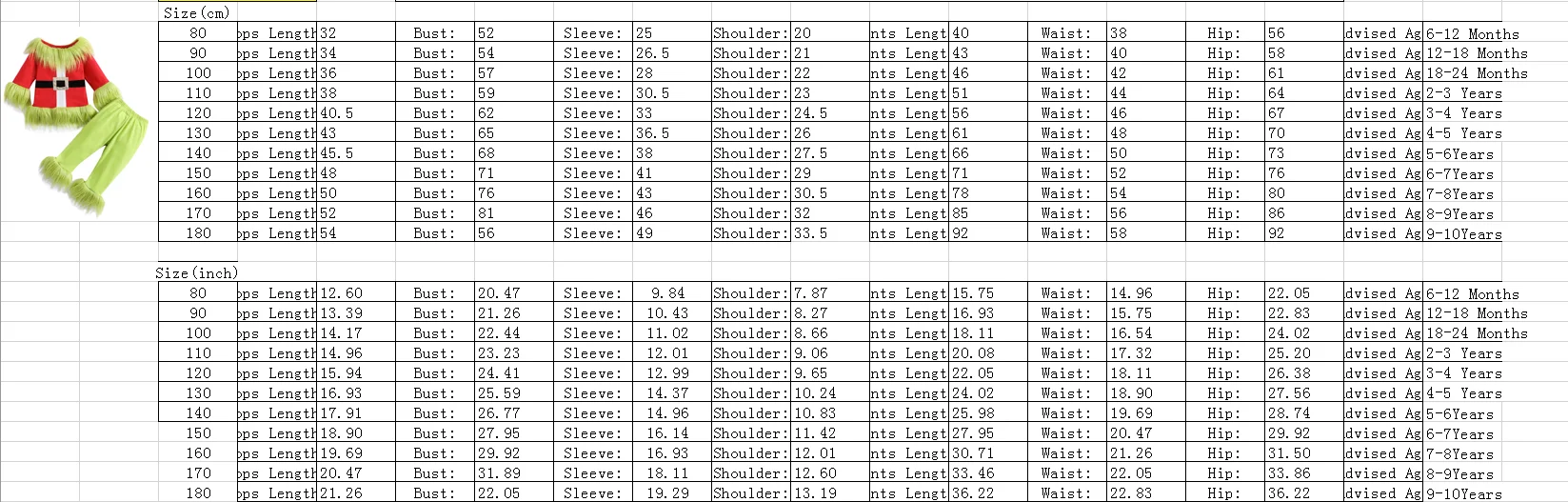 90 Tops Length: 34 Bust: 54 Pant Length: 43 Waist: 40 Sleeve: 26.5 Advised Age: 12-18 Months