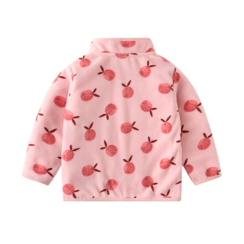 This adorable girls’ fleece jacket is made from ultra-soft, warm fabric to keep little ones cozy and comfortable. Designed in a lovely light pink color, it features a cute all-over fruit print that adds a fun and playful touch.